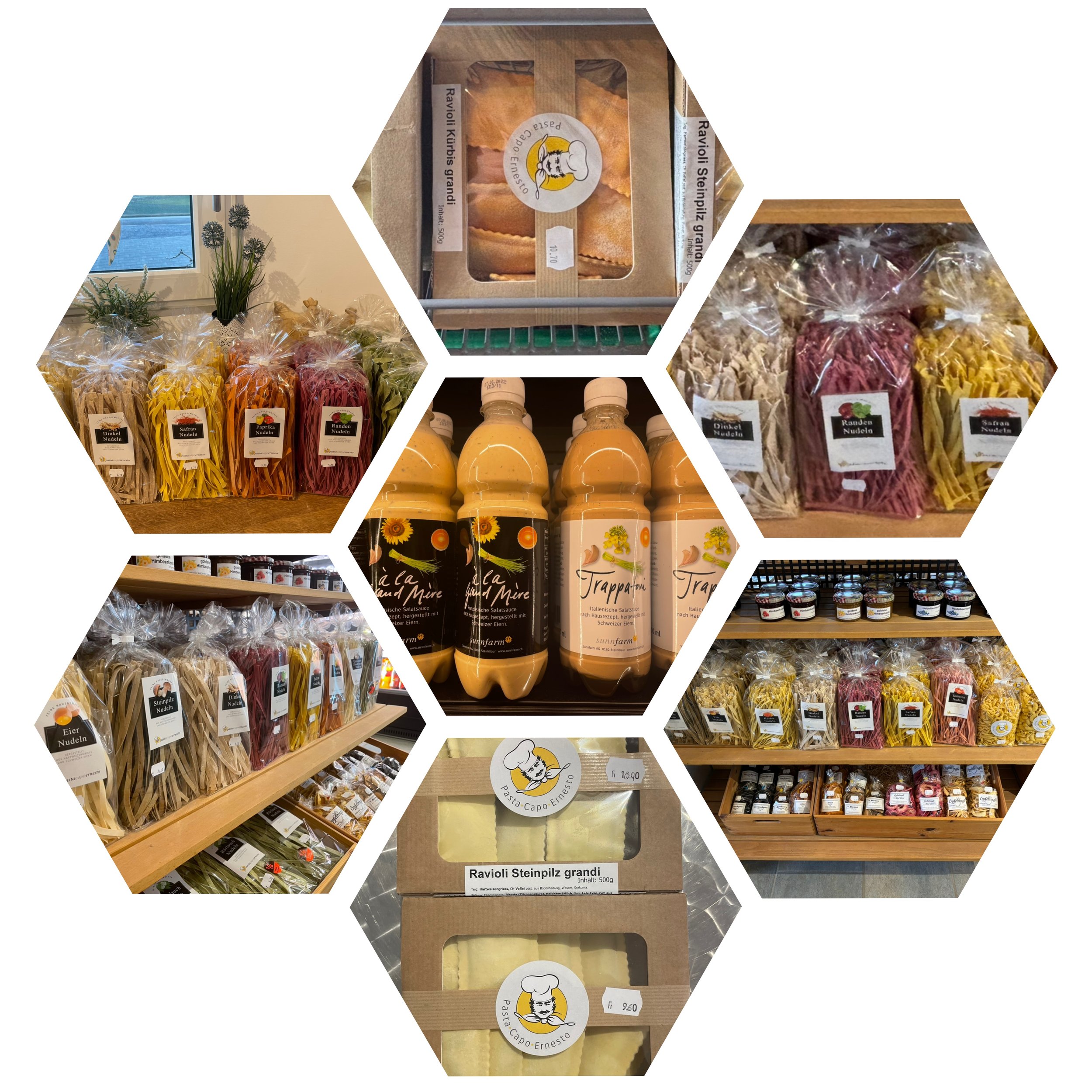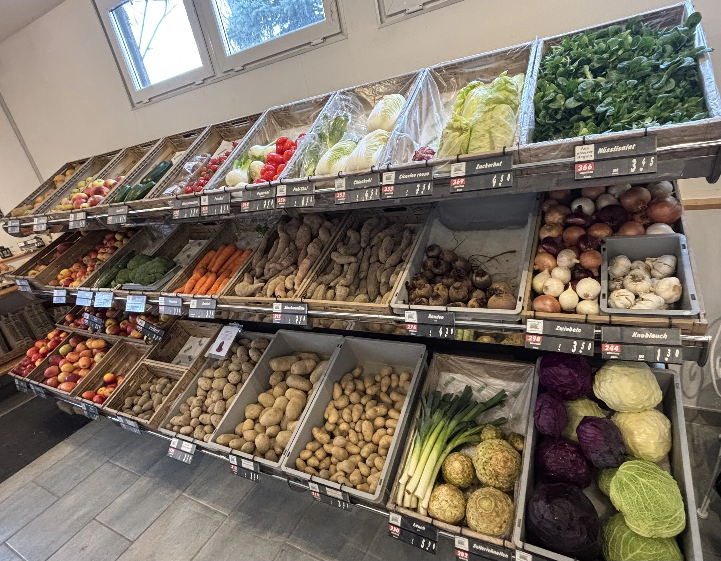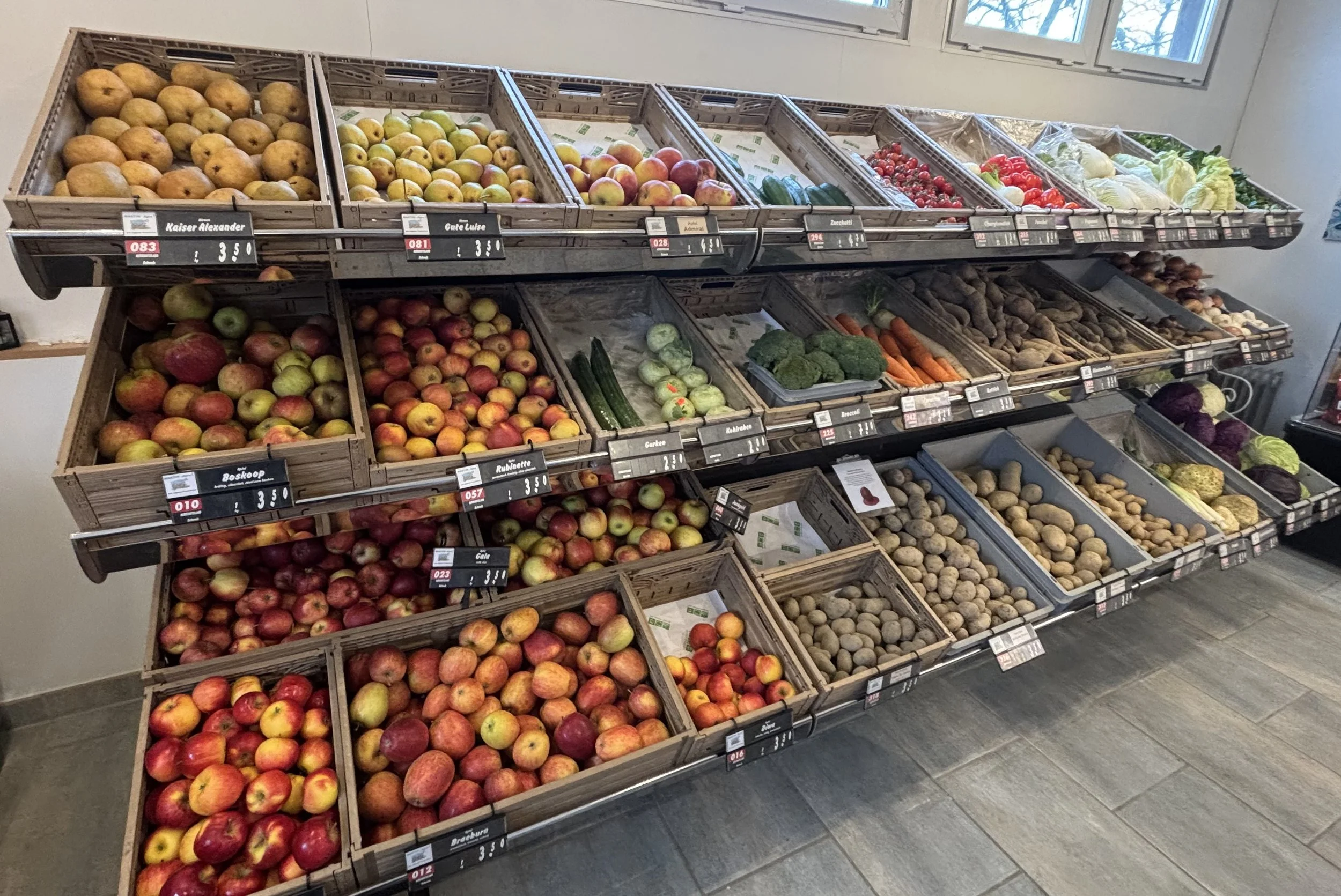 Äpfel, Birnen, saisonale Früchte, Kartoffeln, Süsskartoffeln, Zwiebeln, Knoblach, Randen, Sellerie, Lauch, Rüebli, Kabis, Tomaten, Krautstiel, Salate, Kohlrabi, Fenchel,